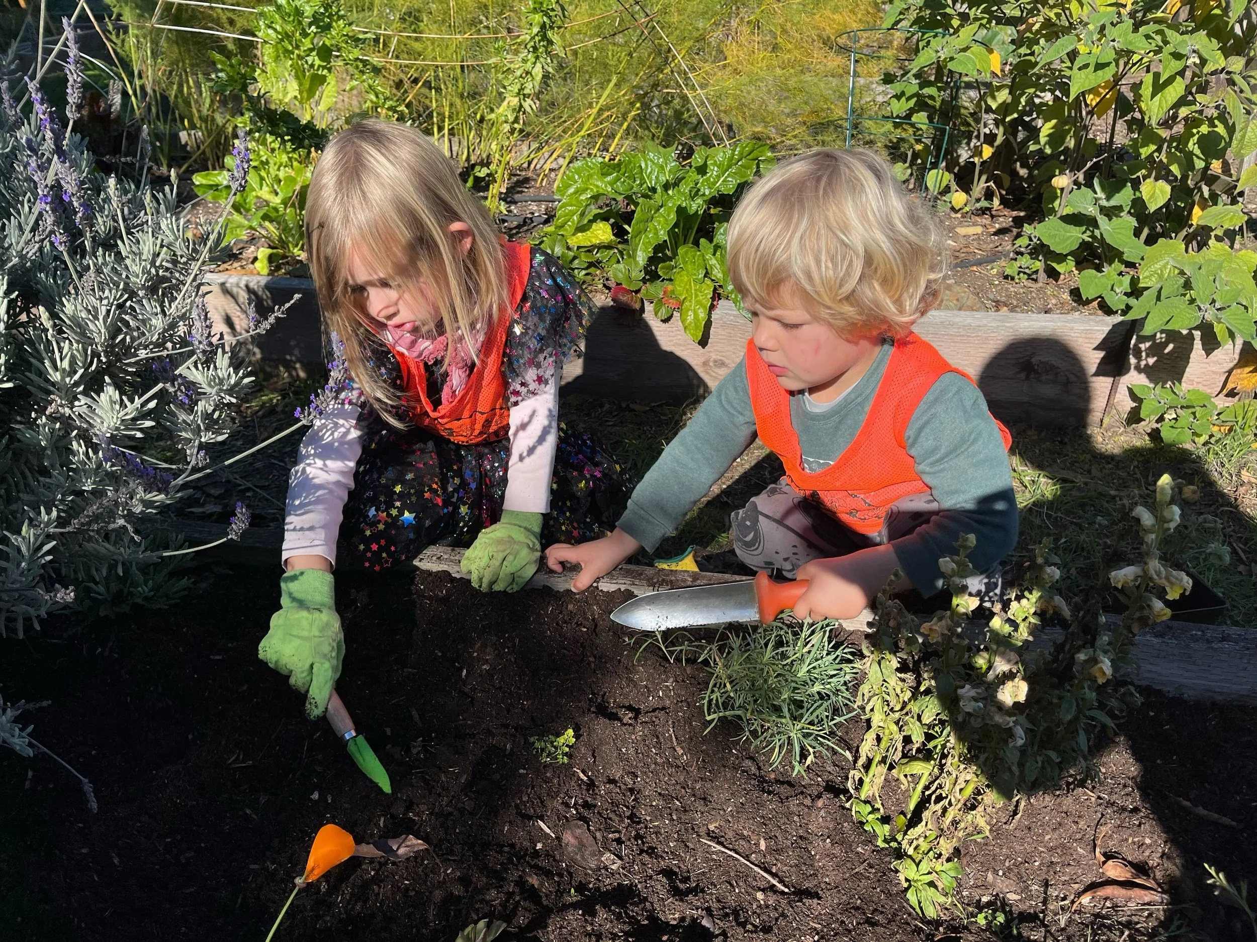 Our school has a garden plot in the Little Red Hen Community Garden, which is just a short stroll from school. Children plant seeds, water, and harvest vegetables, fruits, and herbs year-round.