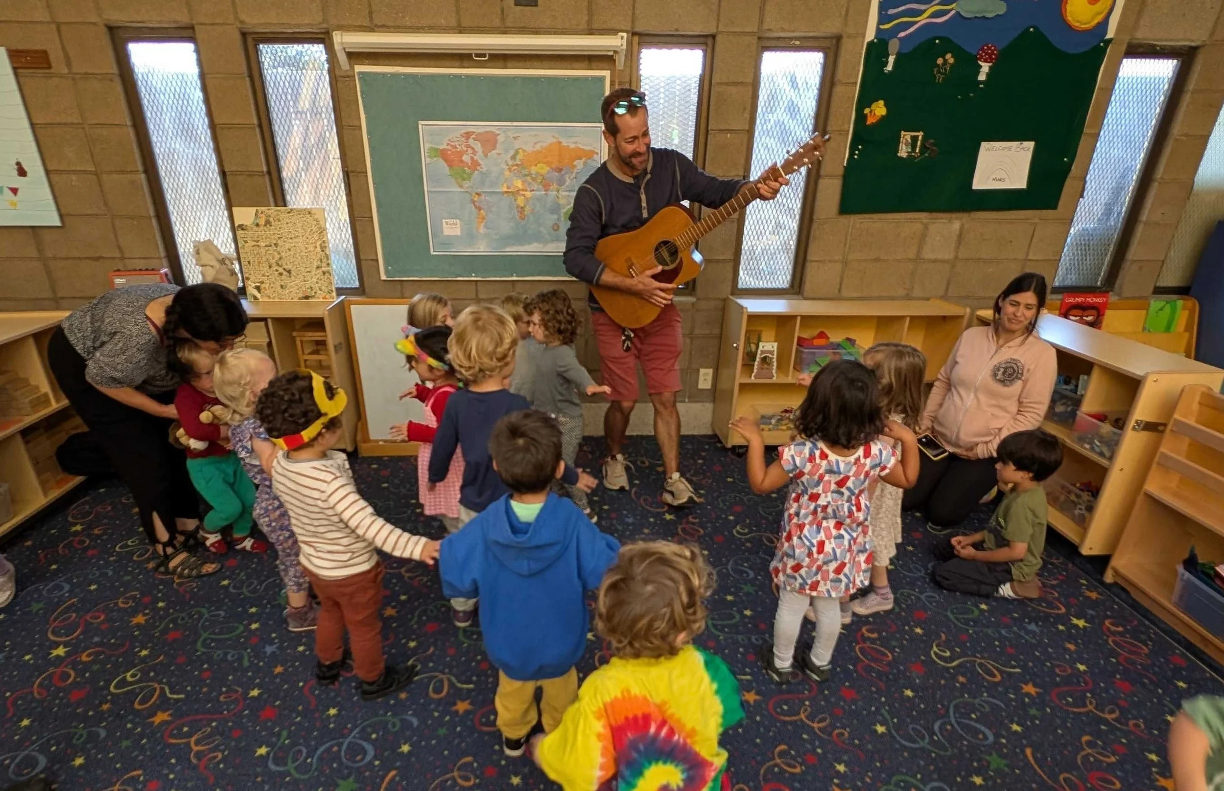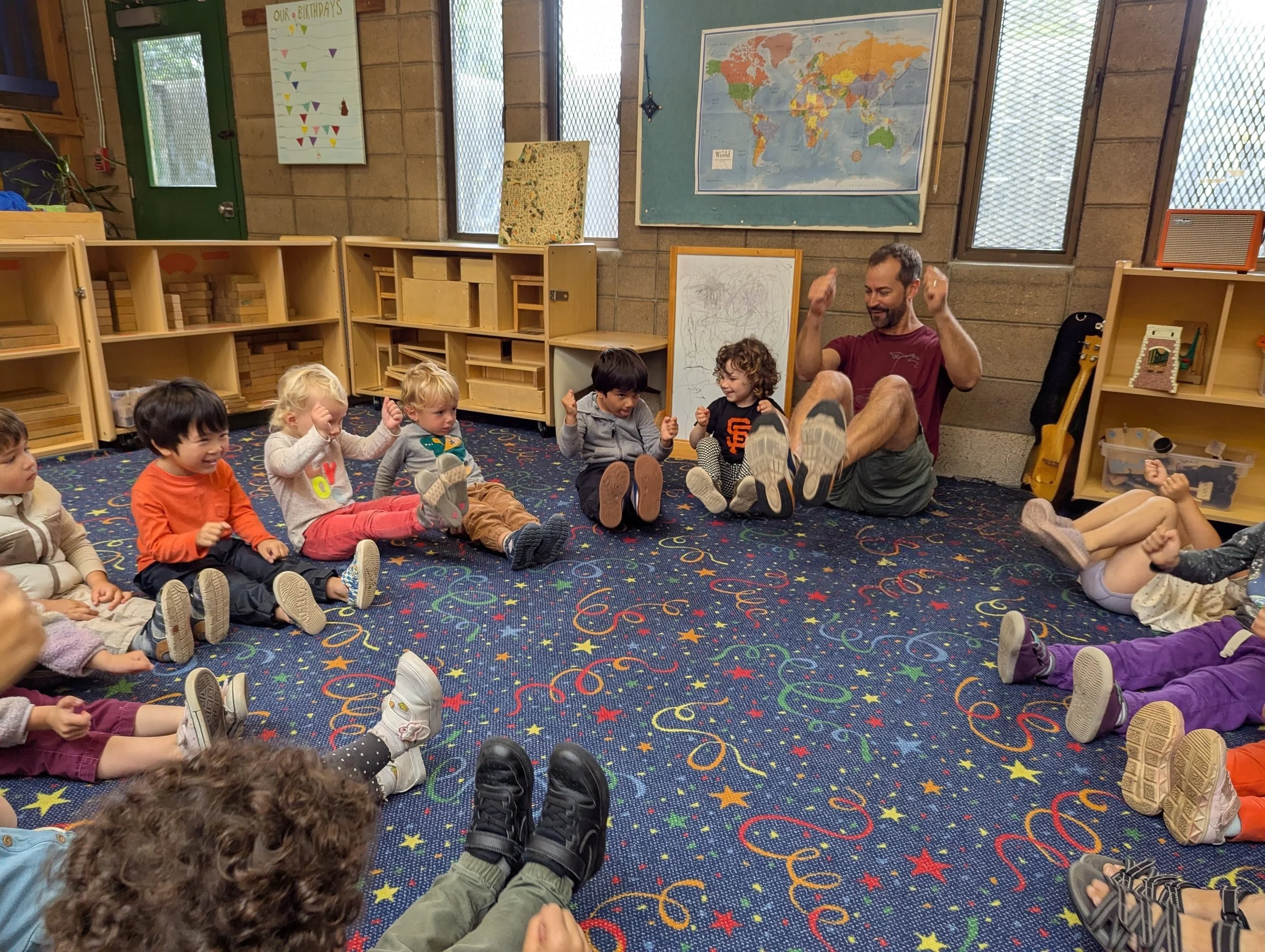 Our weekly music program, led by accomplished musician and educator Daniel Fabricant (a prior NVNS parent), invites children to explore rhythm, melody, and movement through playful games and stories. With experience ranging from preschools to the San Francisco Symphony’s Adventures in Music program, Daniel brings a joyful, age-appropriate approach that makes music-making accessible and fun for every child.